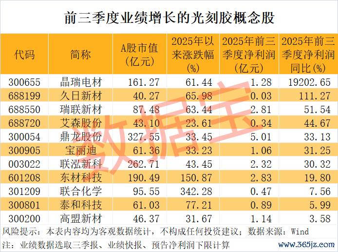 从已公布的2025年前三季度业绩数据来看,数据宝统计,按照三季报、业绩快报、预告净利润下限计算(无下限则取公告数值),11只光刻胶概念股前三季度净利润同比增长(含扭亏为盈),包括晶瑞电材、久日新材、瑞联新材、艾森股份、鼎龙股份等。