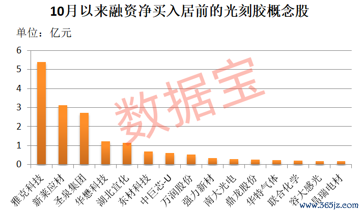 资金面上,数据宝统计,截至10月23日,10月以来融资净买入超1亿元的光刻胶概念股有5只,分别为雅克科技、新莱应材、圣泉集团、华懋科技、湖北宜化。